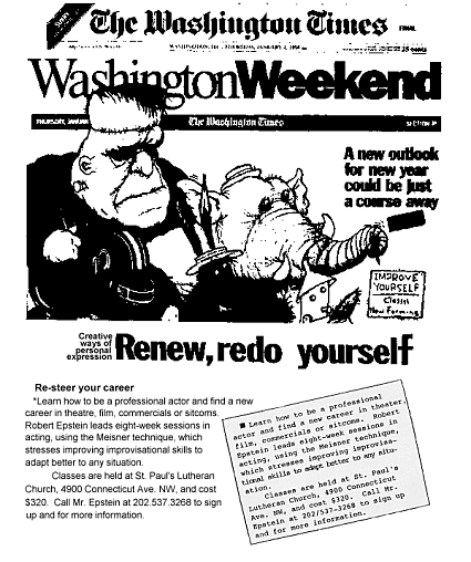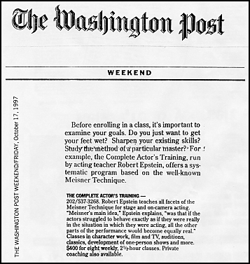 From student Jim Beller Robert, As you can see from the attached, the show I'm in got a rave review from the Washington Post. I worked incredibly hard in rehearsal, but maybe even harder on my own applying the Robert Epstein Technique. I can't express how strongly I believe in the technique. I think I am a great example of an actor who came to you with some significant problems, which your process has enabled me to overcome. Congratulations and thanks. (I even got the part in the first place because I insisted on getting sides in advance and then applied your auditioning technique.) I'm still interested in the classical series. Keep me informed. Jim Beller